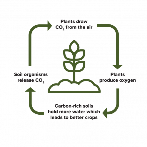 In her paper “Soil as Carbon Storehouse: New Weapon in Climate Fight?” (Yale School of the Environment) Judith D. Schwartz asserts, “Carbon is the main component of soil organic matter and helps give soil its water-retention capacity, its structure, and its fertility.” Better soil means healthier plants; healthier plants draw more carbon dioxide into the soil; more carbon dioxide in the soil means more fertile soil; more fertile soil means healthier plants. Can you see where this is going?
